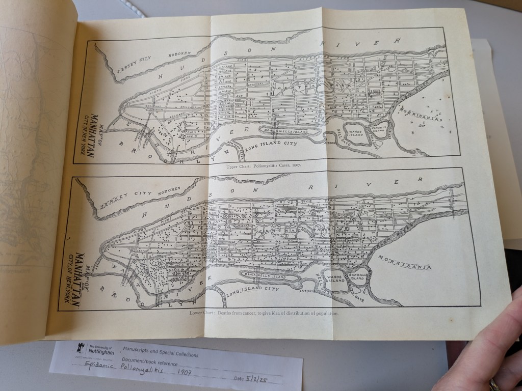While at the University of Nottingham archives I read accounts from a USA outbreak of polio in 1907 in New York City, from a tattered old book owned by a Nottingham doctor who had donated it to the archives:
