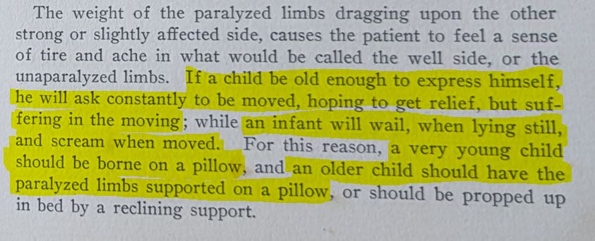 Epidemic poliomyelitis p110-111 “Treatment” describing baths and other attempts to relive children’s pain.