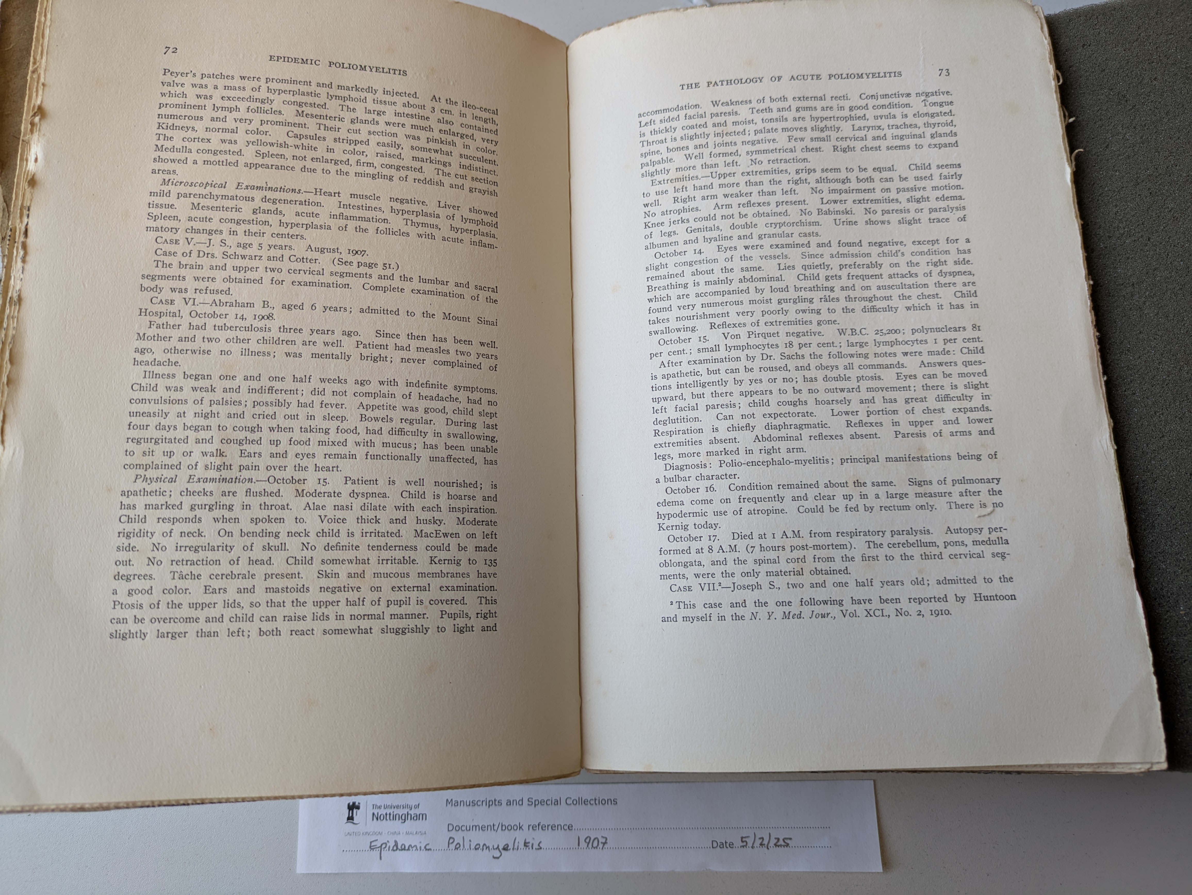 p72-73 from “Epidemic Poliomyelitis: Report of the Collective Investigation Committe on the New York Epidemic of 1907” from Medical Rare Books, classmark WC555 NEW/, Manuscripts and Special Collections, University of Nottingham.