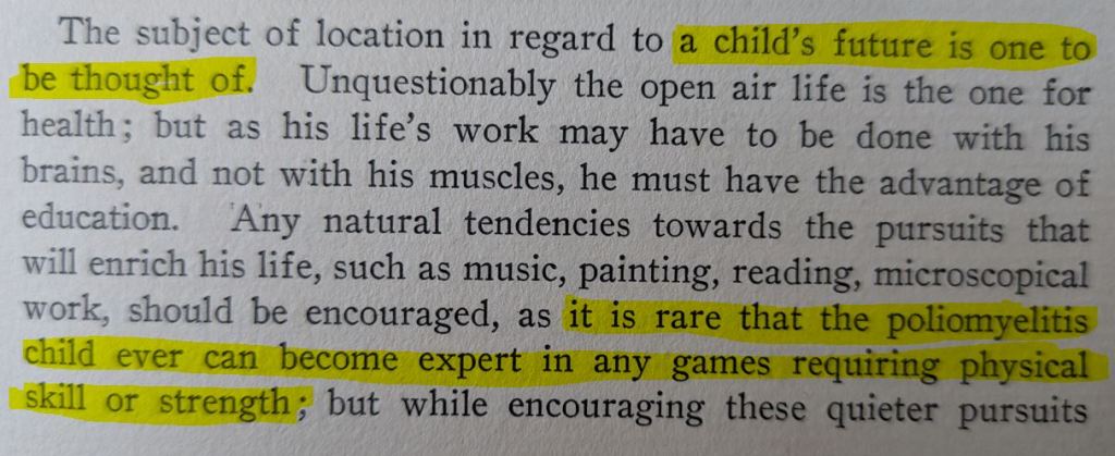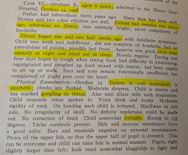 Highlighted excerpt from page 115 of “Epidemic Poliomyelitis: Report of the Collective Investigation Committe on the New York Epidemic of 1907” from Medical Rare Books, classmark WC555 NEW/, Manuscripts and Special Collections, University of Nottingham.