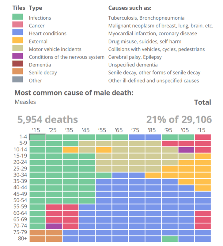 So what’s causing most of the large number of deaths in 1915? The plots below show just the top cause of death for each year by age for men or women in the UK, coloured by category.