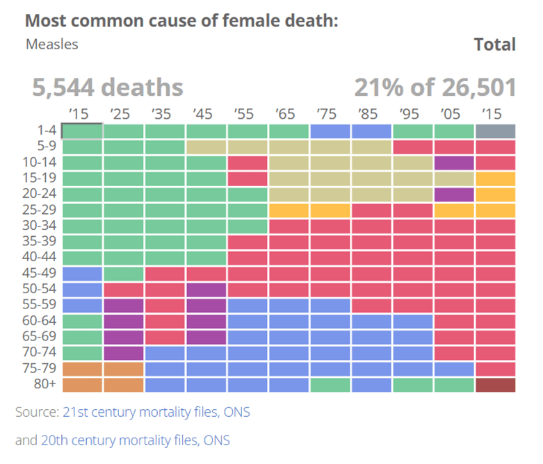 And there’s a similar pattern for females (see below), although more middle-aged women have heart-attacks in 1915 than did men (blue). Heart attacks become the major cause of death in men over 35 from 1955 onward. For women from 1955 cancer (pink), particularly in middle age and heart-attacks (blue), particularly in over 55s, become major causes of death. Deaths from motor vehicle accidents (beige) rise from 1955 for men and 1965 for women: