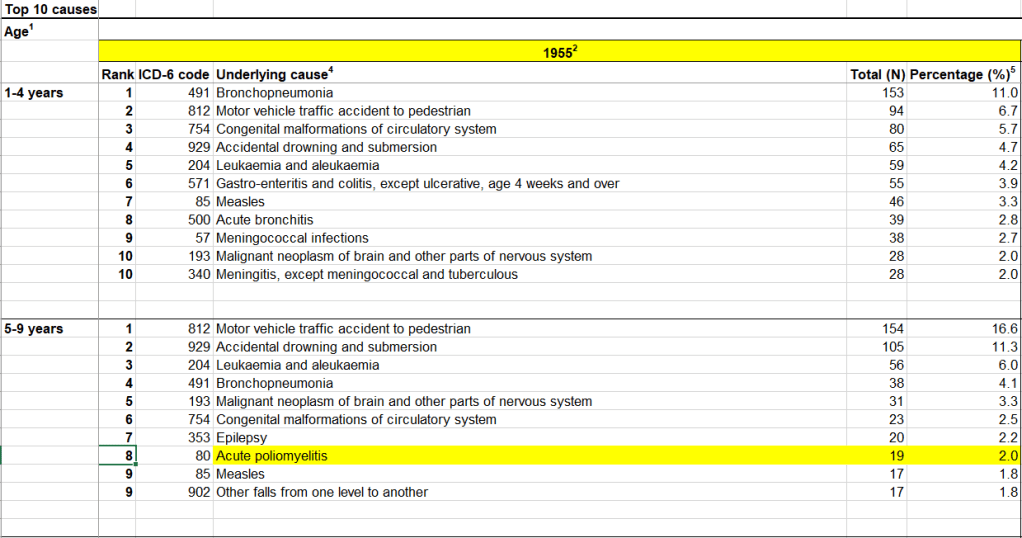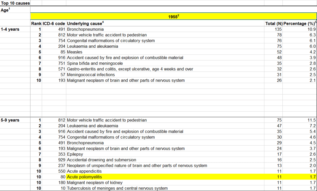 Looking at the ONS data for 1915-2015 in more detail, only in 1955 in 5-9 year olds did polio reach the top 10 causes of deaths. This is the year when a huge epidemic was raging in the UK, elsewhere in Europe and in the USA and people were desperate for a vaccine to protect them.