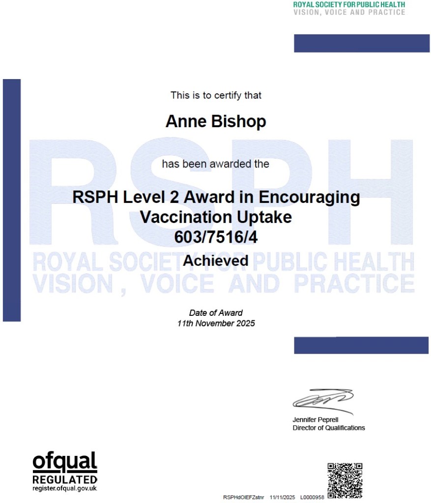 In November 2025 I was awarded a Royal Society for Public Health Level 2 award in “Encouraging Vaccination Uptake” after completing a one day course delivered by the Nottingham City council public health team and an examined and externally-audited post-course assessment.